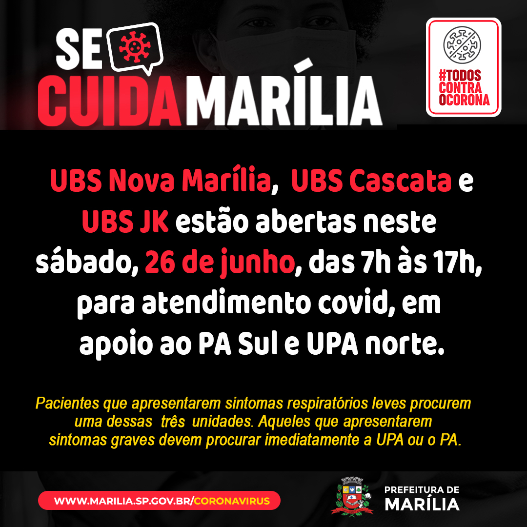 As unidades que estão funcionando são as seguintes: UBS Nova Marília, que fica na avenida Mem de Sá, 360, zona sul da cidade; UBS JK, na rua Lucílio Coelho de Oliveira, 5, na zona norte e UBS Cascata, na rua Cláudio Manoel da Costa, 43 - Banzato.