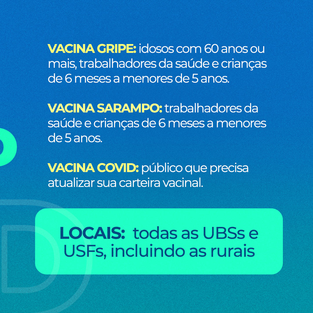 De acordo com a Secretaria Municipal da Saúde, o Dia D de Mobilização Nacional estará acontecendo em todas as unidades de saúde – UBSs e USFs, incluindo as rurais (distritos) -, que estarão abertas das 8h às 16h30.