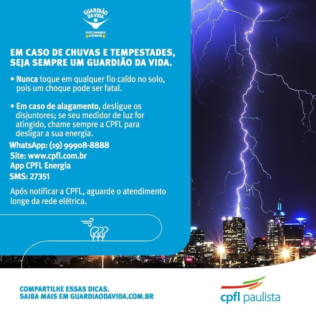 Por isso, a CPFL Paulista ofrienta os clientes a utilizar os seus canais de atendimento, tanto para registrar a interrupção, como para alertar sobre fios soltos e galhos caídos sobre a rede elétrica. A companhia monitora e acompanha junto a órgãos como a Defesa Civil as mudanças climáticas.