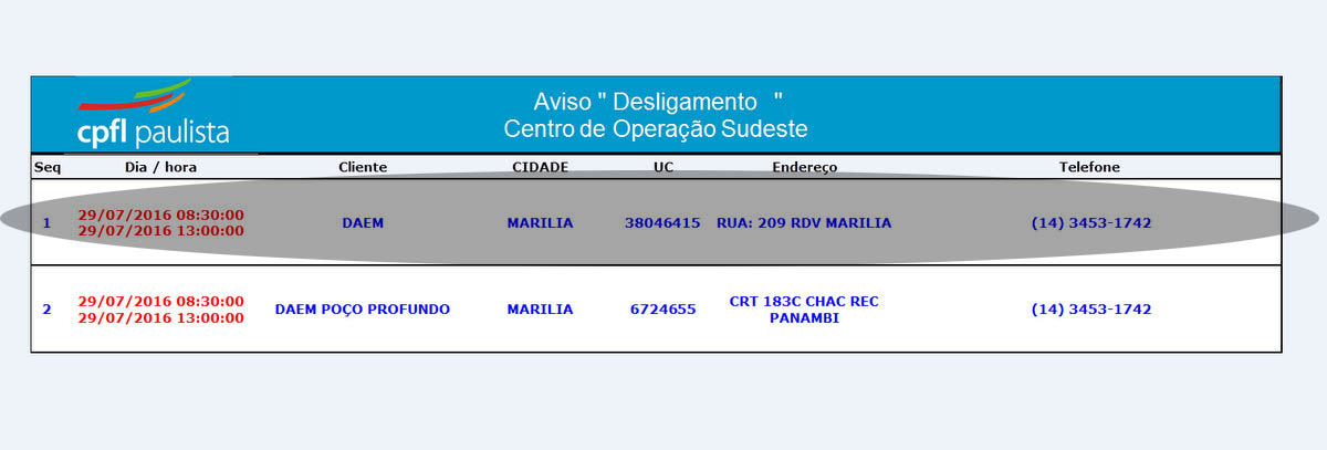 Ao tomar conhecimento dessa notícia, a assessoria de imprensa da CPFL tratou de contestar a informação da Prefeitura: "A CPFL Paulista esclarece que não procede a informação de desligamento programado nos poços profundos do DAEM, de Marília, na data de hoje. Hoje (29/7), ocorreu somente um pisca (interrupção de energia com menos de três minutos de duração), na captação principal de água. O Desligamento Programado, previsto para ocorrer das 8h30 às 13h, atingiu isoladamente um poço nas Chácaras Recreio Panambi".