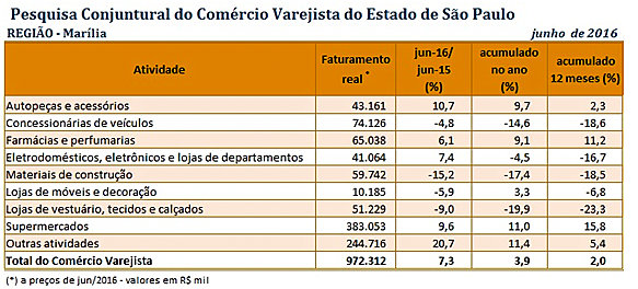 No Estado de São Paulo o faturamento foi menor: elevação de 2,2% na comparação com o mesmo mês de 2015 (R$ 46 bilhões ). No acumulado do primeiro semestre na região de Marília houve elevação de 3,9% e, nos últimos doze meses, aumento de 2%.