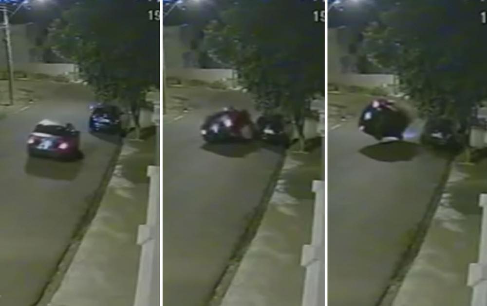 Na sequencia de fotos, o carro segue pela via pública, bate em outro veículo estacionado e em seguida capota.