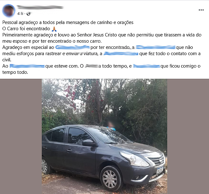 De acordo com postagem feita nas redes sociais por familiares de uma das vítimas, o automóvel já foi localizado. "Primeiramente agradeço e louvo ao Senhor Jesus Cristo que não permitiu que tirassem a vida do meu esposo e por ter encontrado o nosso carro", afirmou a esposa do proprietário. Confira a postagem:
