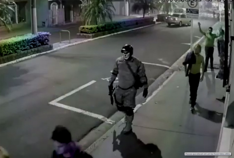 Câmeras de segurança registraram parte da ação. Nas imagens, é possível ver um tumulto de pessoas na rua, algumas com as mãos para cima, e os ladrões atirando para o alto.