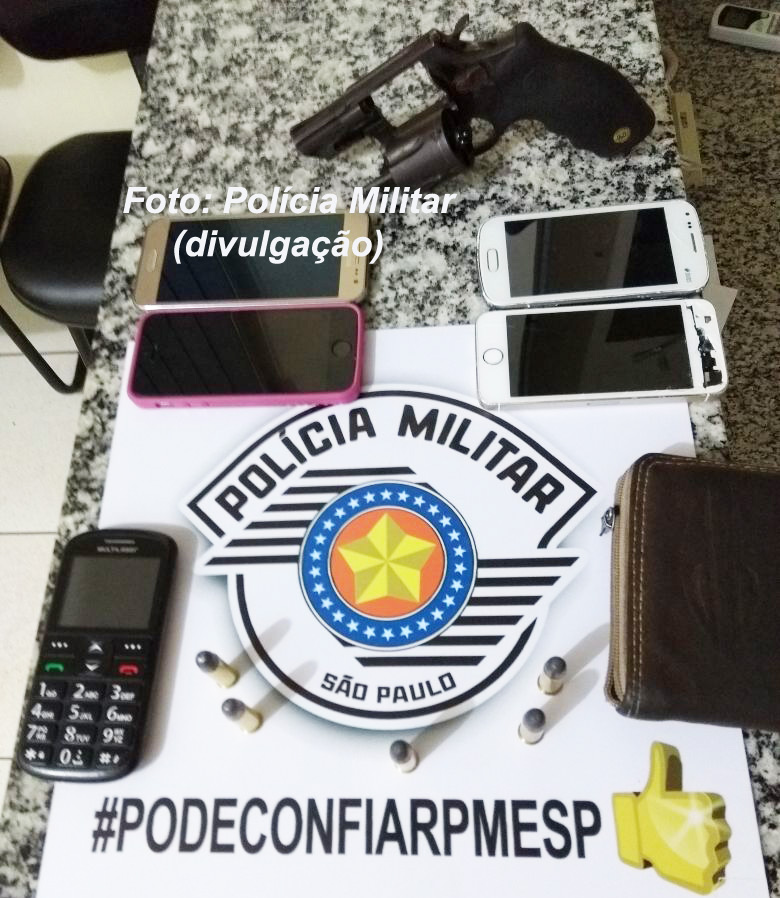 Arma e celulares dos envolvidos na tentativa de assalto.