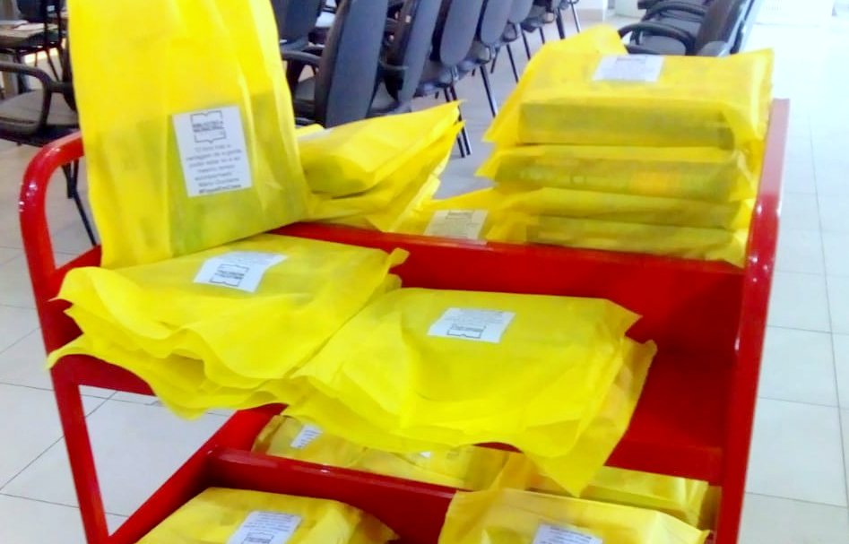 A biblioteca montou 100 kits (foto), com três livros em cada, para repassar ao Fundo Social, que efetuará as doações. Foram selecionados livros para todas as idades.
