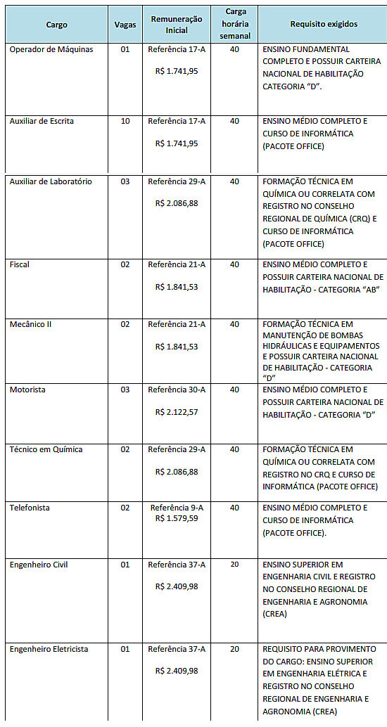 As vagas oferecidas são para diferentes cargos, com destaque para Auxiliar de Escrita (total de 10), além de motorista, mecânico e até de telefonista. O concurso será realizado pela Fundação Vunesp (Fundação para o Vestibular Júlio de Mesquita Filho) em datas, locais e horários que serão divulgados posteriormente.