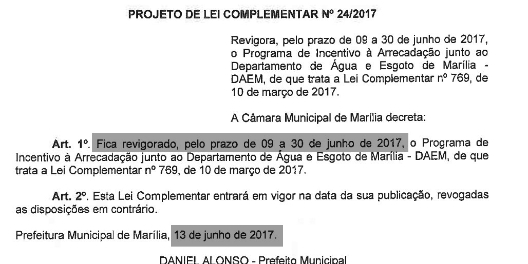 Embora oficialmente o prazo de prorrogação previsto no projeto seja de 9 a 30 de junho, os contribuintes com débitos no DAEM (Departamento de Água e Esgoto de Marília) na prática terão apenas três dias para aproveitar a nova oportunidade prevista no programa de anistia para pagamento de débitos com contas atrasadas. Isso porque o prazo vence nesta sexta-feira (30) e a proposta ainda precisa ser aprovada hoje à noite pela Câmara Municipal e só entra em vigor após ser sancionada e publicada.