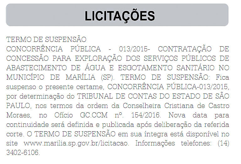 A Prefeitura de Marília publico nesta quarta-feira (25), no Diário Oficial Eletrônico do Município, o "termo de suspensão" da concorrência pública que pretende fazer concessão, à iniciativa privada, dos serviços executados pelo DAEM (Departamento de Água e Esgoto de Marília). A medida foi tomada por determinação do Tribunal de Contas (TCE) que acolheu representação do ex-vereador Eduardo Nascimento, “com efeito devolutivo e suspensivo” das medidas anteriores.