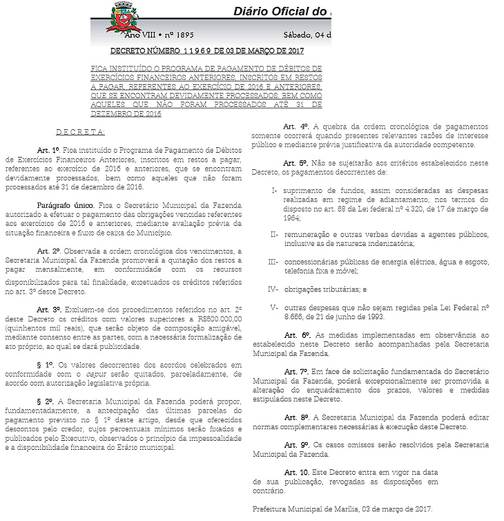 O prefeito Daniel Alonso publicou neste sábado, no Diário Oficial Eletrônico, um decreto estabelecendo o "Programa de Pagamento de Débitos de exercícios financeiros anteriores, inscritos em restos a pagar", ou seja, dívidas deixadas pelo ex-prefeito Vinícius Camarinha referentes ao exercício de 2016 e anos anteriores.