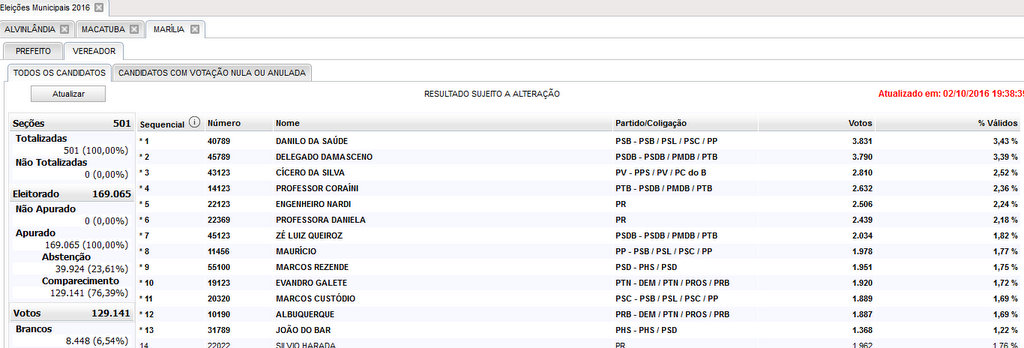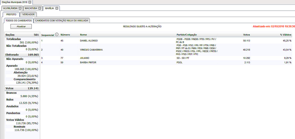 Alonso, do PSDB, que foi eleito com 45,25 % dos votos (50.113) contra 48.218 votos de Vinicius Camarinha. Daniel ficou a frente de Vinicius Camarinha durante todo o tempo da apuração. Em determinados momentos até quase empatados. Vinicius Camarinha chegou a % dos votos.