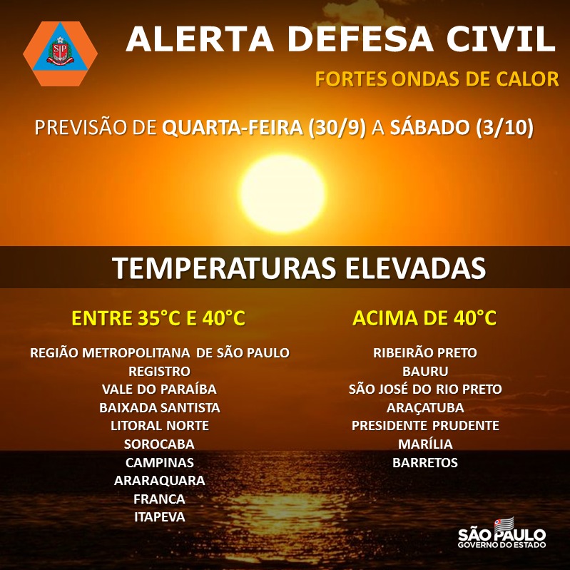 A Coordenadoria Estadual de Proteção e Defesa Civil alerta para a elevação significativa das temperaturas e a sensação de calor intenso em todo o estado de São Paulo até sábado (3). O tempo seco toma conta de todo o Estado. Nesta manhã em Marília, às 6h, os termômetros já registravam 24 ºC.