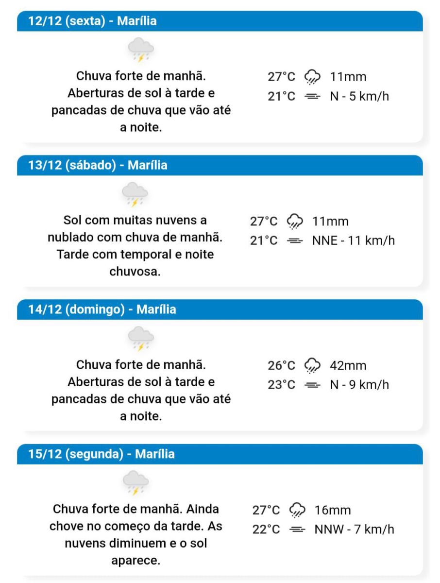 A Defesa Civil Estadual emitiu alerta para a possibilidade de chuva forte neste fim de semana, inclusive no domingo em Marília. Mesmo com o aviso, os volumes pluviométricos previstos para hoje e amanhã permanecem moderados, com estimativa de 11 milímetros em cada dia.