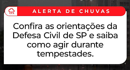 - Para receber alertas da Defesa Civil, envie um SMS com o CEP da região para o número 40199 ou acompanhe as redes sociais pelo @defesacivilsp.