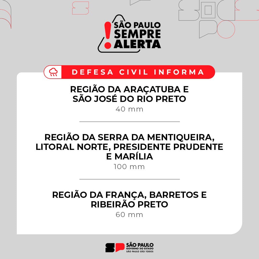 Para a região de Marília a estimativa é de até 100 mm de chuva, quantidade que também deve cair na região de Presidente Prudente. Em Bauru/região, deve chover um pouco menos, em torno de 90 mm. Já em Araçatuba/região, são esperados acumulados de 40 mm.
