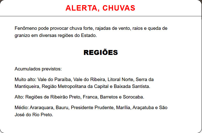 A Defesa Civil do Estado de São Paulo emitiu um alerta para chuvas intensas entre este domingo (23) e terça-feira (25) em diversas regiões do Estado de São Paulo.