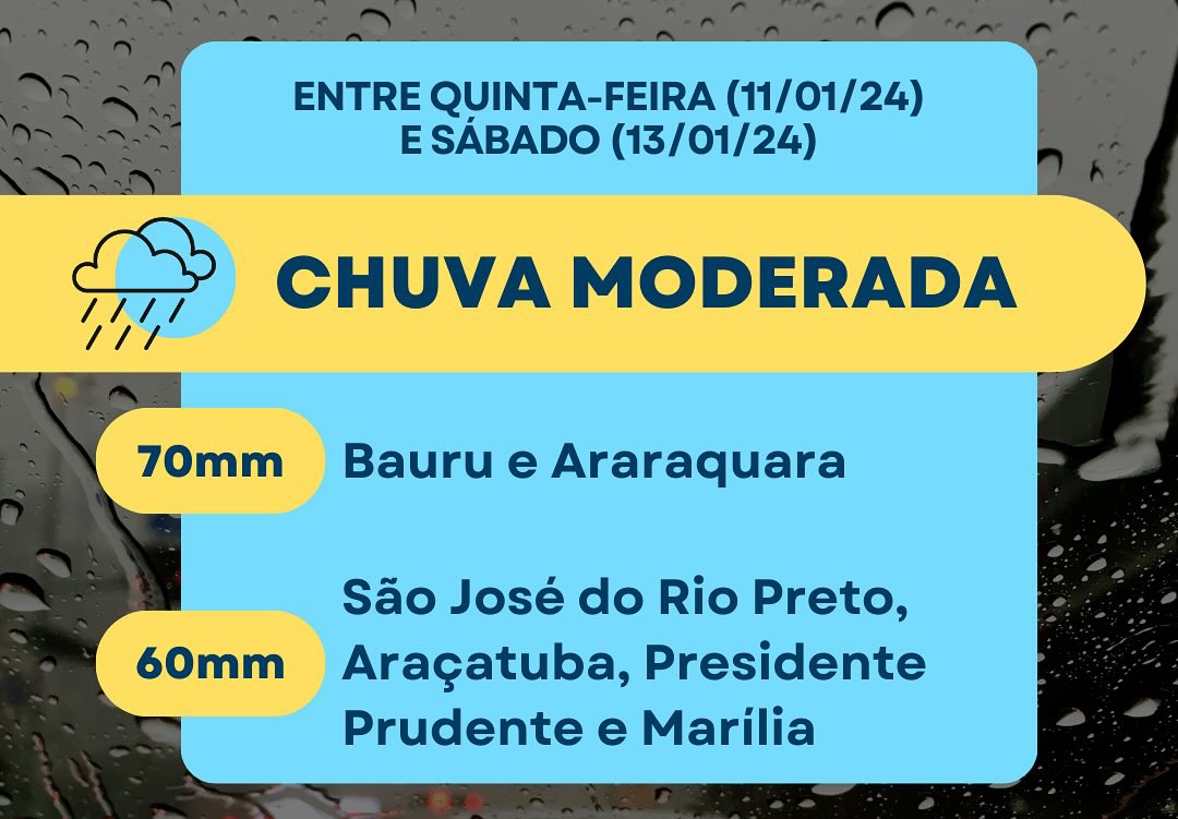 Nas regiões de Marília, Presidente Prudente, Araçatuba e Rio Preto, a previsão é de que deeva chiver em torno de 60 mm. Já em Bauru, pode chover um pouco mais (em torno de 70 mm).