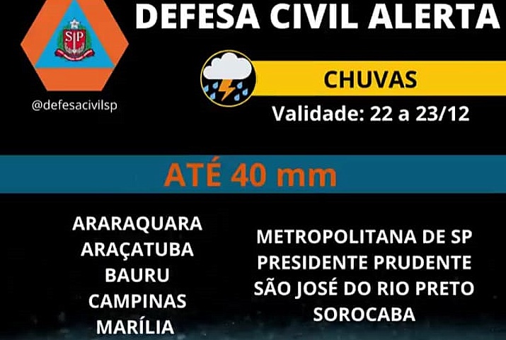 "Diante deste cenário recomenda-se atenção especial as áreas mais vulneráveis, pois há risco de deslizamentos, desabamentos, alagamentos, enchentes e ocorrências relacionadas a raios e ventos", acrescenta a Defesa Civil paulista.