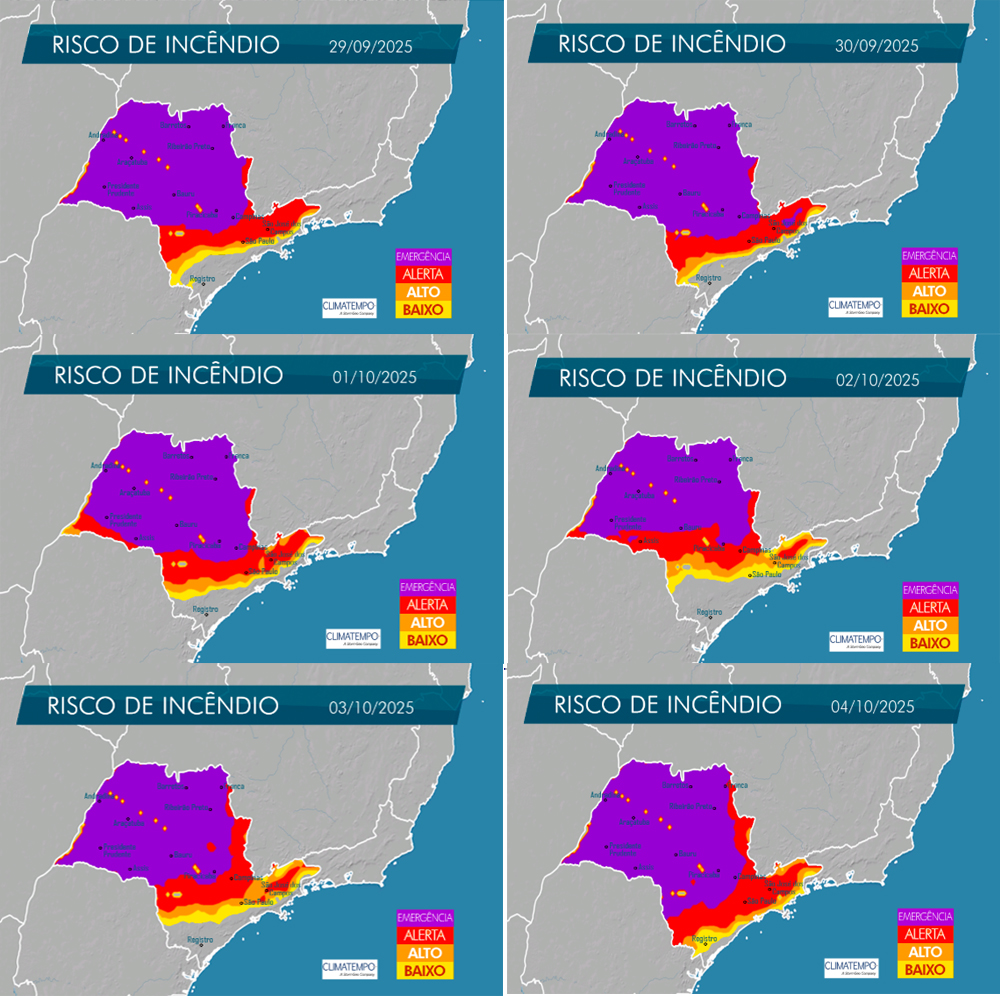 A Defesa Civil do Estado de São Paulo informa que entre esta segunda-feira (29) e sexta-feira (3) a combinação de temperaturas elevadas e baixos índices de umidade relativa do ar aumenta significativamente o risco de incêndios florestais e queimadas nas regiões de Marília, Bauru, Presidente Prudente, Araçatuba, São José do Rio Preto, Campinas, Sorocaba, Araraquara, Barretos, Franca, Ribeirão Preto e Vale do Paraíba.