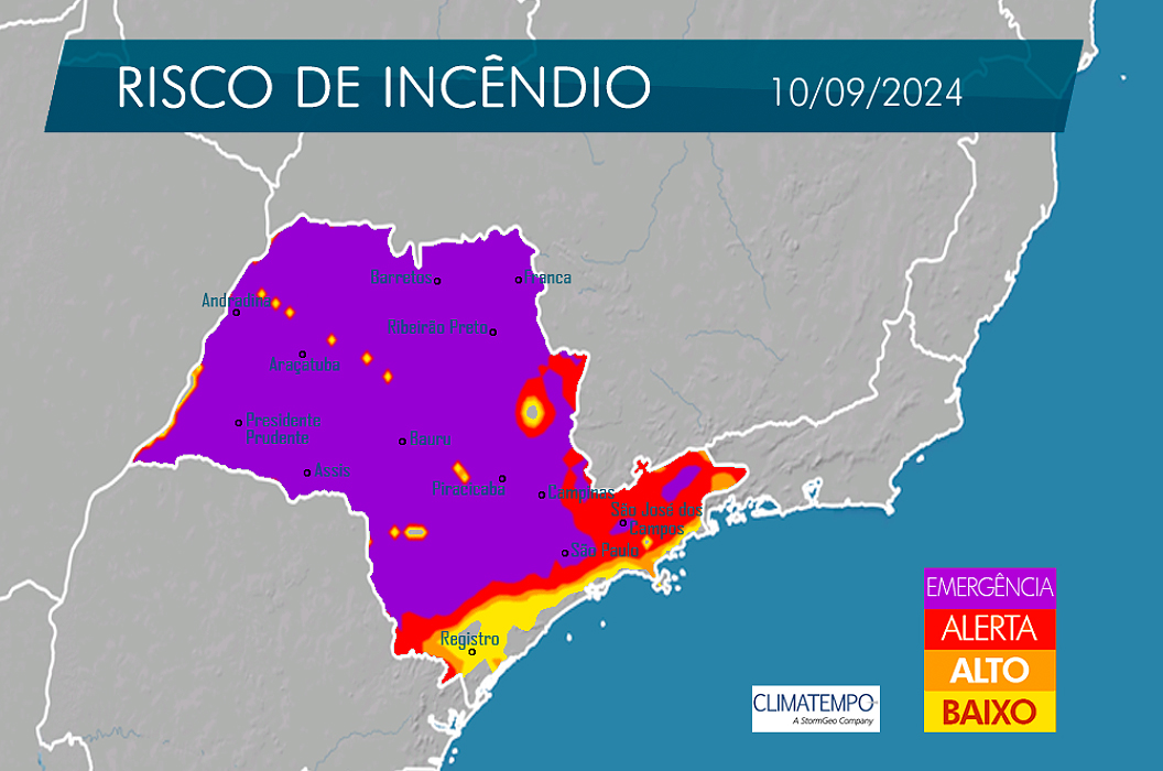 O Mapa de Risco da Defesa Civil, usado no monitoramento, aponta para a possibilidade de queimadas em todo o território paulista.