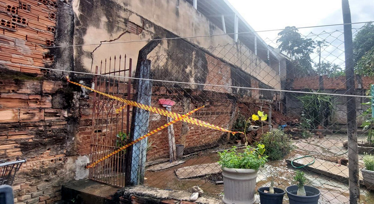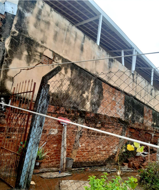 Durante a vistoria técnica, foi constatado que o muro localizado na divisa com o imóvel da Rua Alfeu Cesar Pedrosa, 295, cedeu completamente, provocando a movimentação de terra e comprometendo a estrutura da casa.