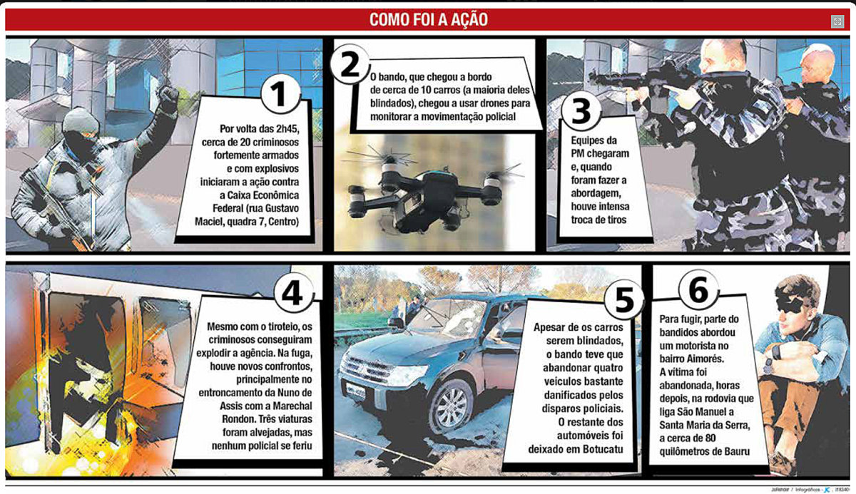 A ação de ontem ação durou cerca de uma hora e resultou em uma intensa troca de tiros entre policiais militares e assaltantes. Os bandidos usaram até drone para monitorar a polícia.