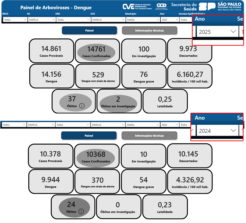 Comparativo do número de casos de dengue/óbitos em Marília nos anos de 2025 e 2024.