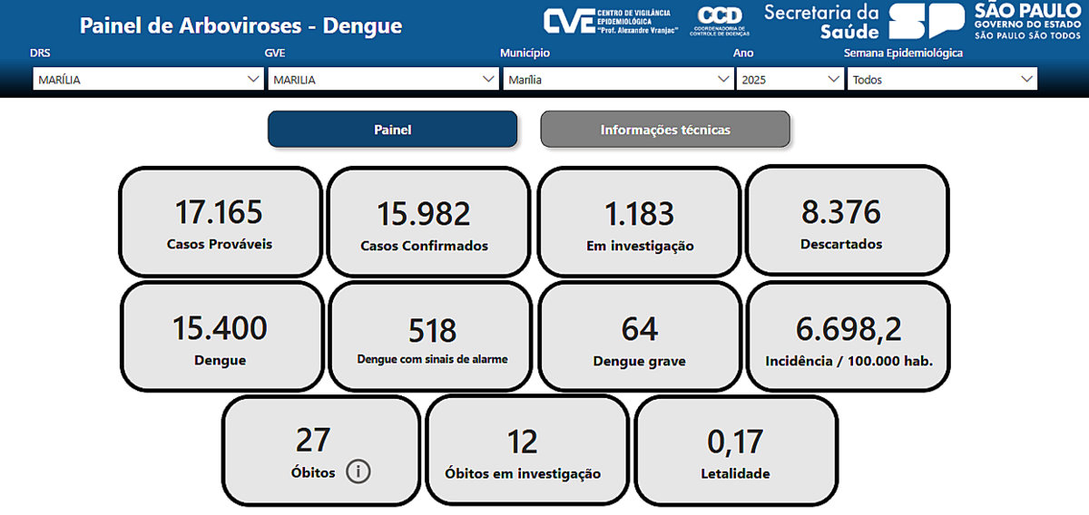 Pelo levantamento oficial, Marília está com 15.982 casos confirmados, sendo 518 pacientes em situação de alarme e 64 em estado grave. Existem outros 18.348 suspeitos, sendo 1.183 que já coletaram exames de sangue. Foram descartados 8.376 exames.