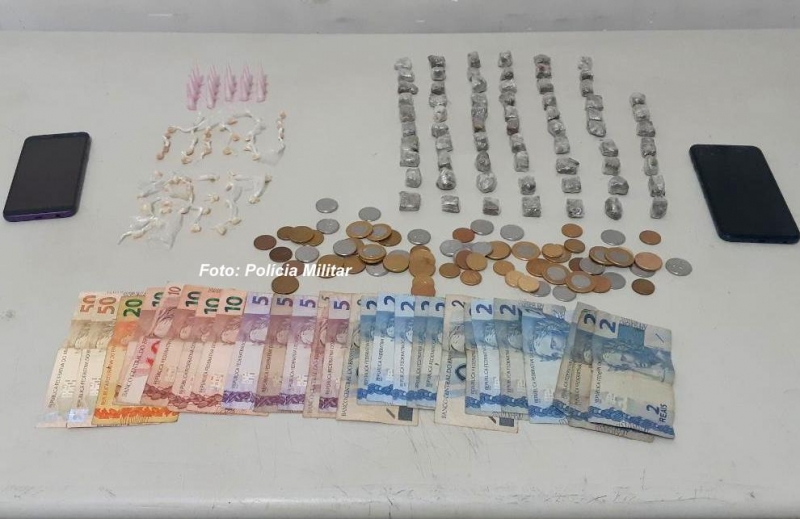 Em revista no automóvel, foi apreendido um estojo contendo 67 porções de maconha, 51 de crack, 17 de cocaína e a quantia de R$ 246,15.