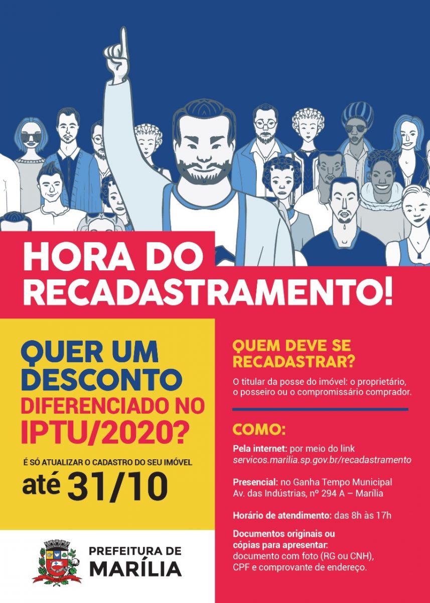 A Prefeitura de Marília, por meio das secretarias municipais da Fazenda e de Tecnologia da Informação, lembra aos contribuintes que o prazo de recadastramento dos imóveis terminará no próximo dia 31 de outubro.