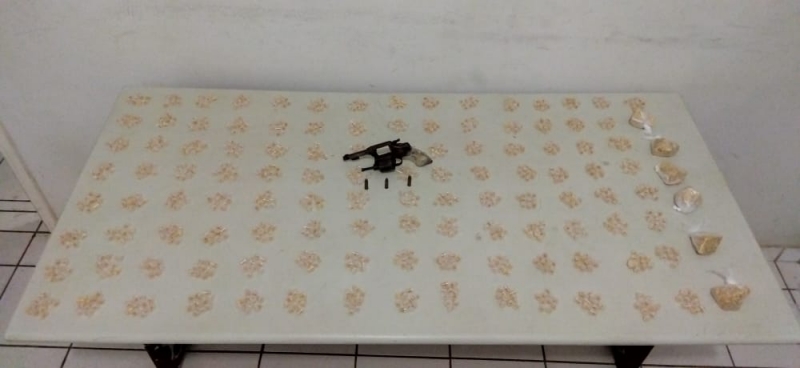 A busca pessoal não constatou irregularidades. Na revista veicular a droga e a arma foram encontradas debaixo do banco do motorista. Eram 1.130 pinos de crack e duas porções.