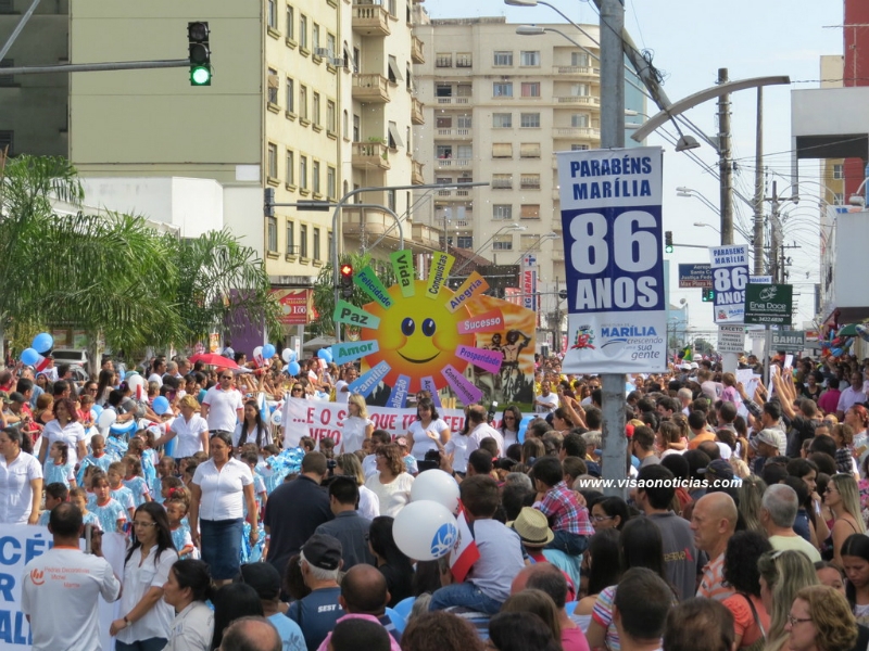 O desfile cívico-militar, em comemoração aos 86 anos de Marília, lotou a avenida Sampaio Vidal por quase duas horas na manhã deste sábado. Foram inúmeras atrações, entre viaturas, bandas e fanfarras, apresentações das crianças, de órgãos municipais e estaduais. Ao final, um presente para todos: bolo e refrigerante de graça!