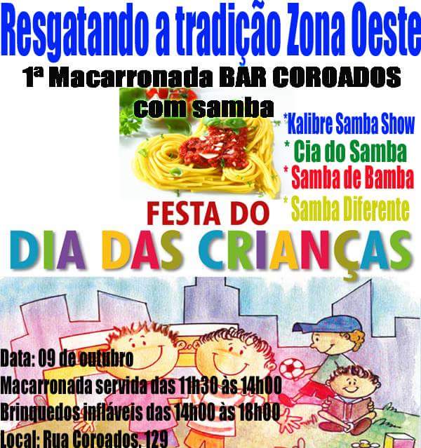 Bar Coroados) realiza hoje (09) a Festa do Dia das Crianças. Será um almoço especial com direito a macarronada, frango frito, refrigerantes, doces, pipoca. além de brinquedos infláveis.