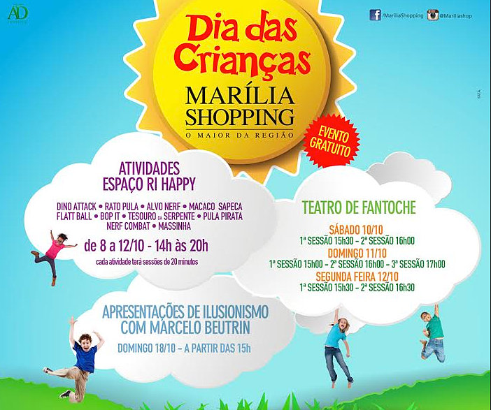 E, para a comemoração do dia das crianças ser completa, as atividades se estendem até o dia 18 de outubro, quando o Marília Shopping recebe o mágico Marcelo Beutrin e seu assistente Mister Klaus que irão oferecer uma combinação de truques de todos os campos da arte mágica, interagindo com os visitantes de uma forma criativa com os números mais modernos e surpreendentes.