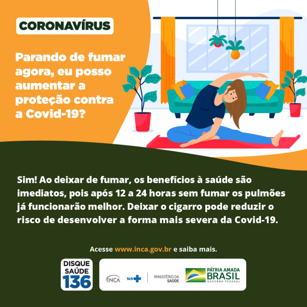 Por esse motivo, o Instituto Nacional de Câncer José Alencar Gomes da Silva (Inca) escolheu como mote da campanha deste ano do Dia Nacional de Combate ao Fumo (29 de agosto) o tema Tabagismo e Coronavírus.