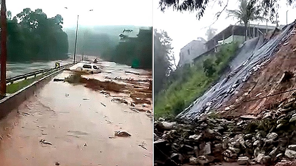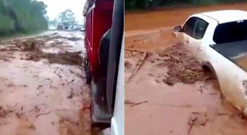 Trecho de rodovia foi inundado por lama e rejeito de minério, arrastando carros e caminhonetes.