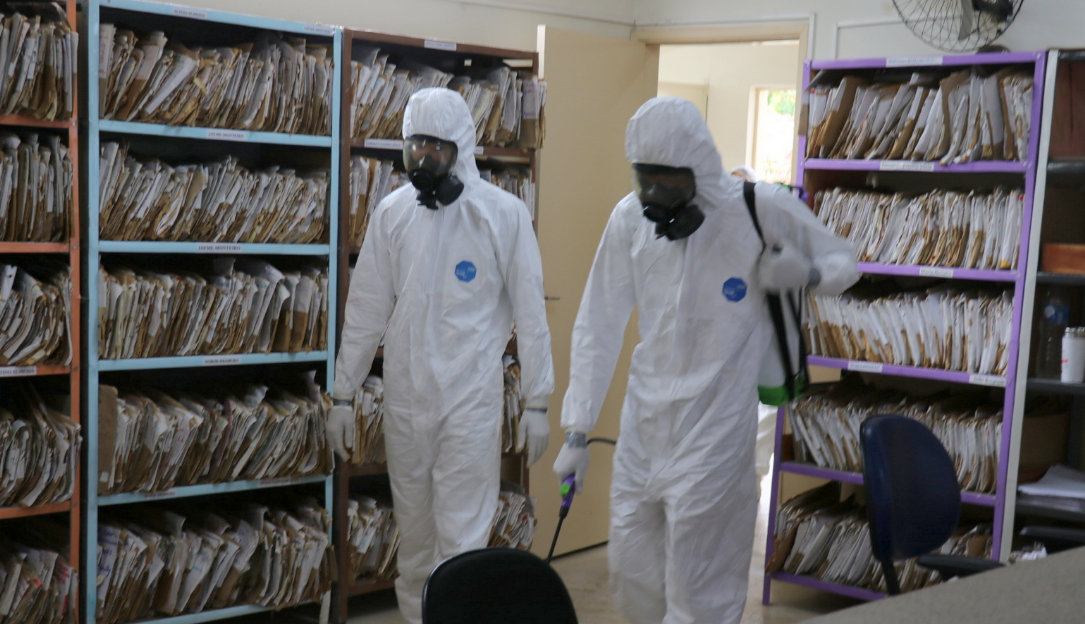 O processo de desinfecção é dividido em três etapas: aplicação de solução desinfetante (hipoclorito), seguido de aplicação de água e aplicação de solução de álcool a 70% nos locais de uso coletivo.