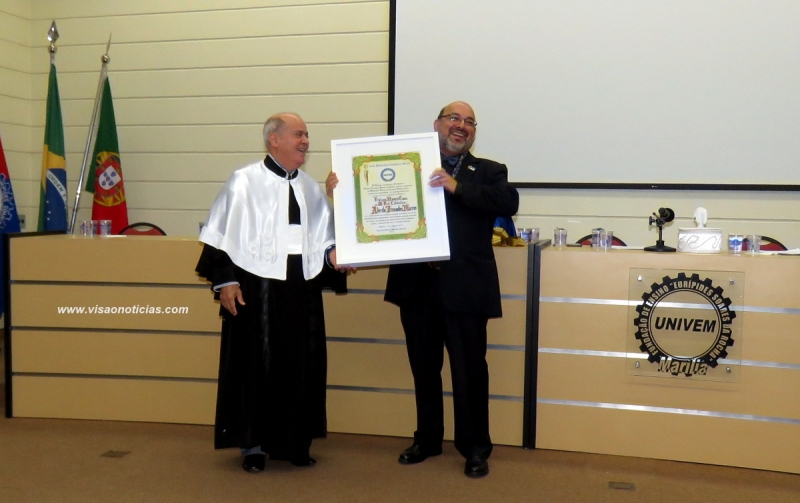 Em reconhecimento aos relevantes serviços prestados em prol do desenvolvimento institucional e pela projeção que está sendo alcançada no ensino e na pesquisa, o diretor e fundador do Doutorado em Média-Arte Digital da Universidade Aberta de Portugal (UAB), Adérito Fernandes Marcos, recebeu nesta segunda-feira (10) o título de Professor Honoris Causa concedido pelo Univem (Centro Universitário Eurípides de Marília).