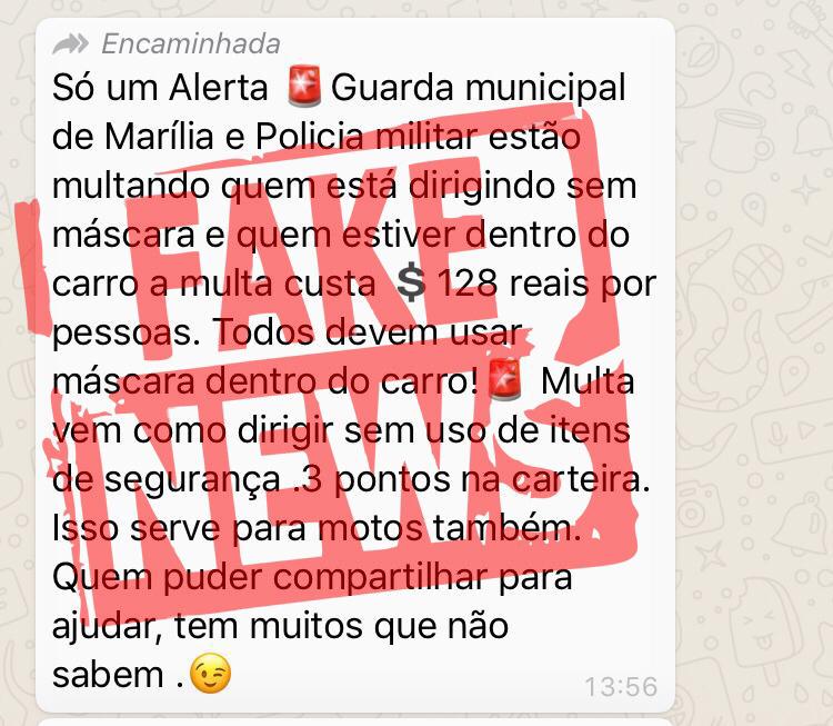 A Emdurb (Empresa Municipal de Mobilidade Urbana) divulgou nota oficial no final desta tarde desmentindo uma mensagem que está circulando nas redes sociais sobre a aplicação de multas em Marília para quem estiver sem máscaras dentro dos veículos. De acordo com a assessoria, trata-e de uma informação falsa.