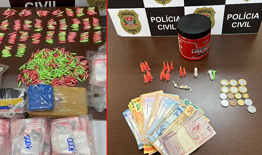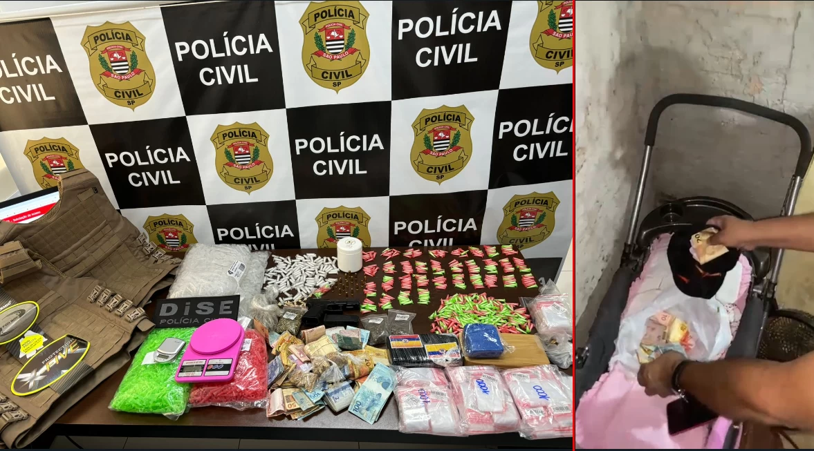 Com eles, foram localizadas porções de cocaína, maconha e crack escondidos dentro de um carrinho de bebê, além de dinheiro. Os dois foram presos em flagrante.