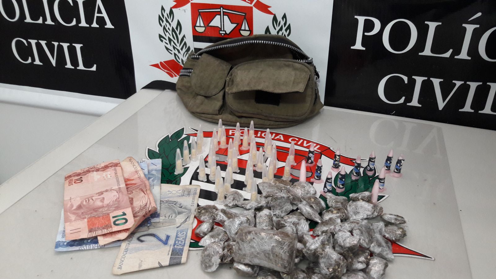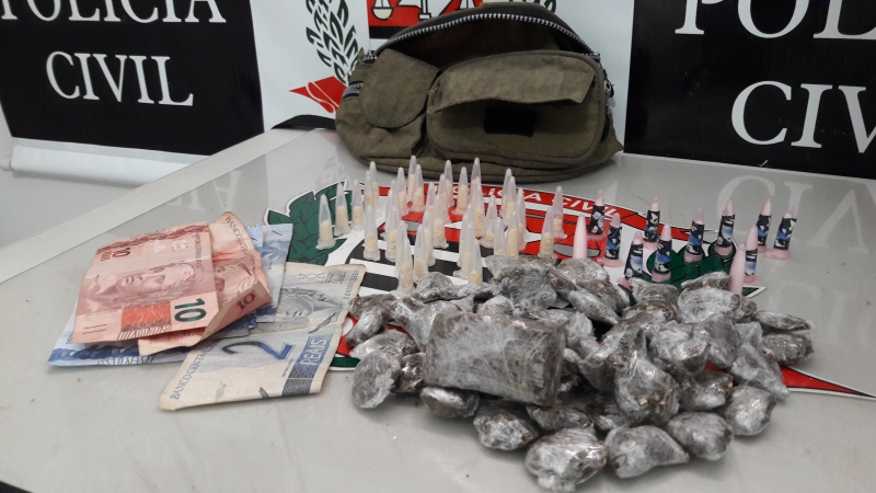 De acordo com informações da Polícia Civil as equipes realizavam diligências pela rua Francisca de Oliveira quando no cruzamento com a Odila Barreto avistaram um menor que já era investigado por promover o tráfico de drogas no local. O adolescente, de 16 anos, acabou detido antes que pudesse tentar fugir e com eles os policiais apreenderam 58 porções de maconha embaladas para a venda, além de 12 pinos de cocaína e 37 pinos de crack. Em um de seus bolsos os policiais localizaram também R$ 30 em notas diversas, fruto da venda dos entorpecentes.