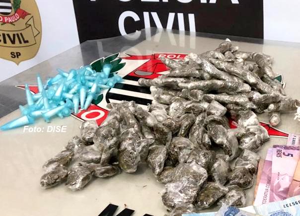 A DISE (Delegacia de Investigações sobre Entorpecentes) prendeu dois desempregados, de 18 e 21 anos, com porções de maconha, cocaína e dinheiro. Foi ontem no conjunto de apartamentos da CDHU, na zona Sul da cidade.