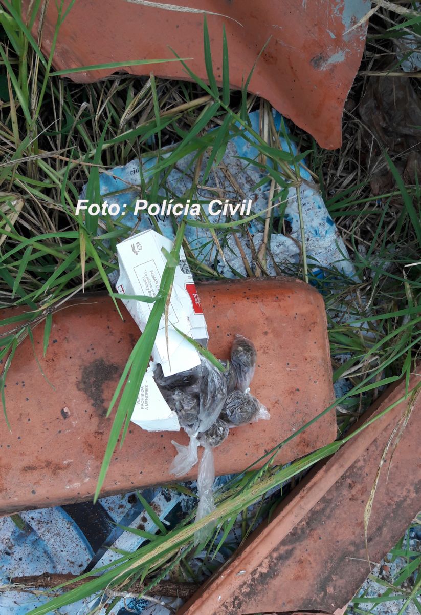 Porções de drogas escondidas no meio do mato.