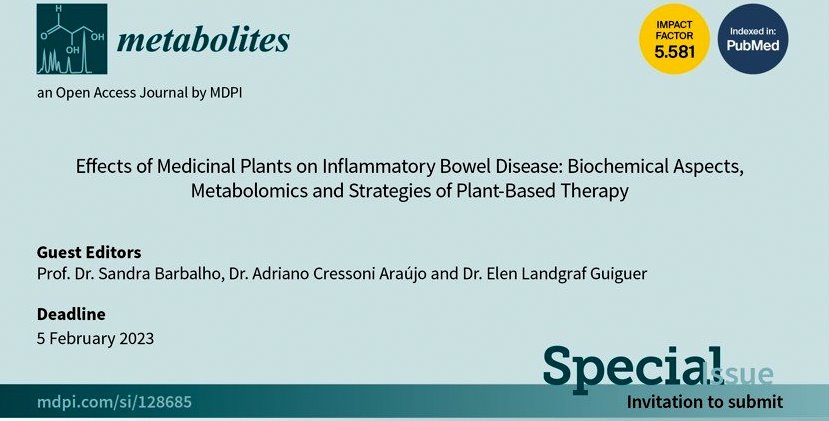 A edição especial "Efeitos das Plantas Medicinais na Doença Inflamatória Intestinal: Aspectos Bioquímicos, Metabolômica e Estratégias da Terapia à Base de Plantas" da revista Metabolites, trará a discussão sobre o potencial das plantas medicinais e como podem ser usadas na terapia das doenças inflamatórias intestinais. Com o convite, os docentes serão os responsáveis pela seleção das pesquisas que serão publicadas.