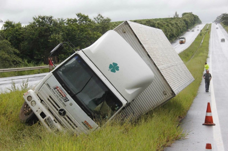 Com o impacto da colisão, o caminhão se desgovernou e chegou a tombar e também cair no meio da canaleta. O motorista não se feriu.