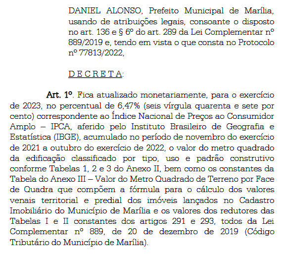 Os proprietários de imóveis em Marília vão pagar mais caro pelo IPTU (Imposto Predial e Territorial Urbano) no ano que vem. A Prefeitura reajustou em 6,47% esse tributo, conforme decreto assinado pelo prefeito Daniel Alonso e que foi publicado no Diário Oficial do município neste fim de semana.