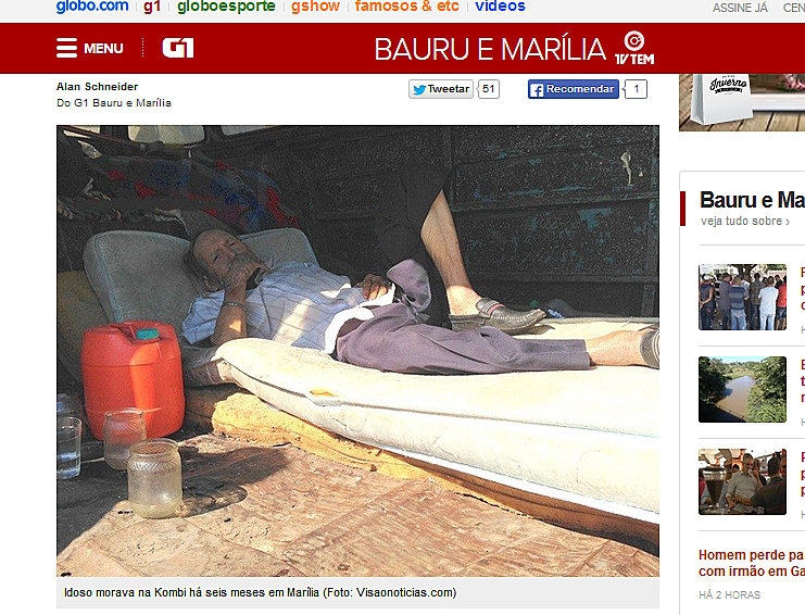 A reportagem exclusiva do portal Visão Notícias.com, sobre o aposentado Delfino Barbosa, de 72 anos, que há seis meses morava numa Kombi, teve grande repercussão nos principais portais de internet do país. As postagens sobre o caso tiveram mais de 11.200 visualizações e 37 compartilhamentos na nossa Fan Page.