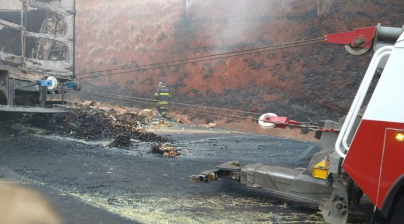 De acordo com a Polícia Rodoviária, um caminhão, que carregava bandejas de ovos, seguia pela rodovia no sentido capital quando bateu na traseira de uma carreta, que levava cana-de-açúcar, e pegou fogo.