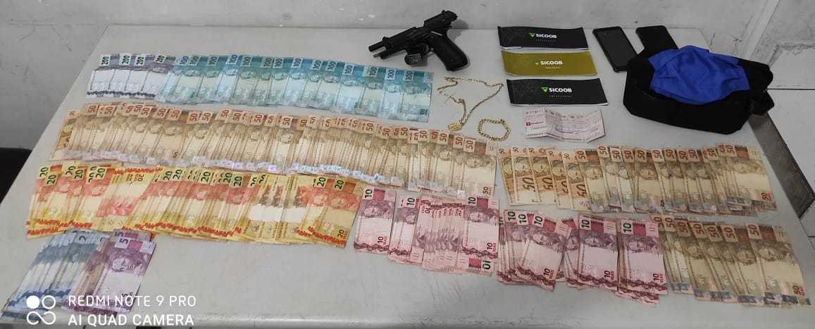 Dois assaltantes foram presos acusados de roubar folhas de cheque, talonários, dinheiro, corrente e pulseira de ouro, tudo avaliado em mais de R$ 21 mil. O assalto aconteceu em uma padaria no bairro central da cidade, no início da noite desta segunda-feira (19).