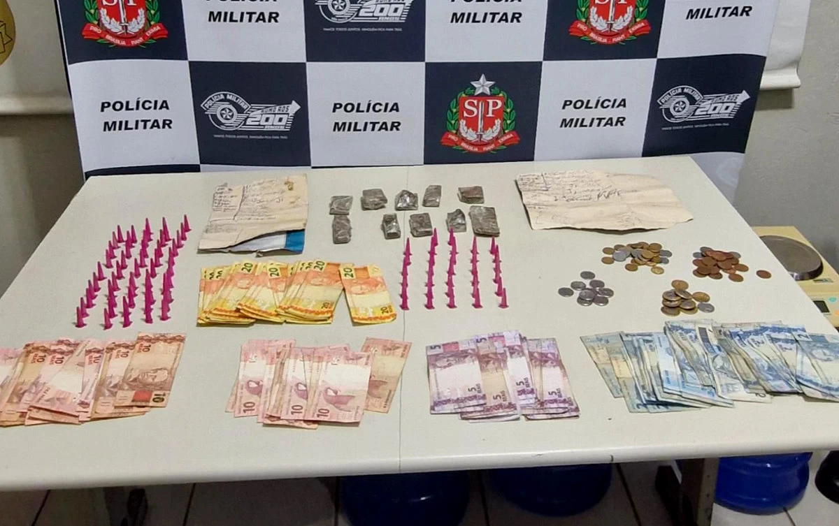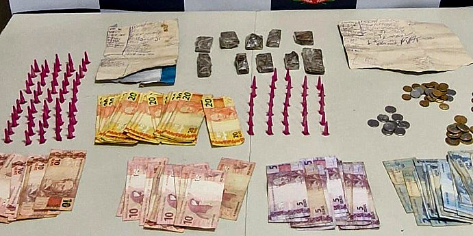 Foram apreendidas 95 porções de drogas (entre maconha e cocaína), R$ 1.622,00 e também a contabilidade do tráfico, ou seja, as porções que já haviam sido vendidas naquele local como forma de "prestar contas" ao gerente da biqueira.
